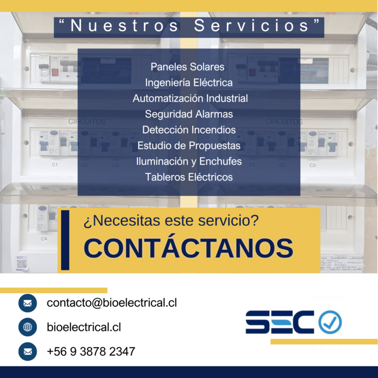 Instalaciones Eléctricas y montajes eléctricos. Reparaciones, Mantenimiento preventivo y correctivo. Alarmas y Seguridad biométrica. Detección Preventiva contra incendios. Elaboración de documentos eléctricos y tramitación SEC.